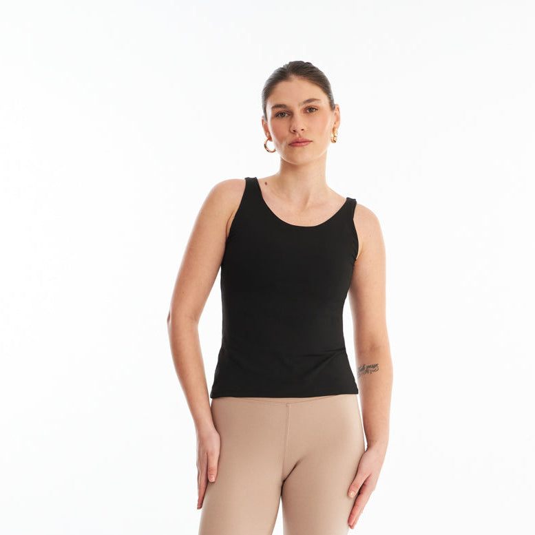 A Blusa Afinidade é uma blusa com as alças regulares. Confeccionada em poliamida com tecnologia sustentável e elastano, com dupla camada e elástico na parte do busto, a Blusa Afinidade proporciona segurança quanto à transparência, sustentação, conforto e toque agradável como um abraço. Sua modelagem ajustada ao corpo, refinado acabamento e costura embutida garantem um bom caimento. O decote redondo frente e costas, a bainha estreita e delicada são detalhes que agregam carinho e cuidados com a peça.