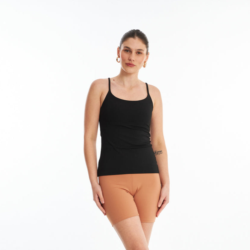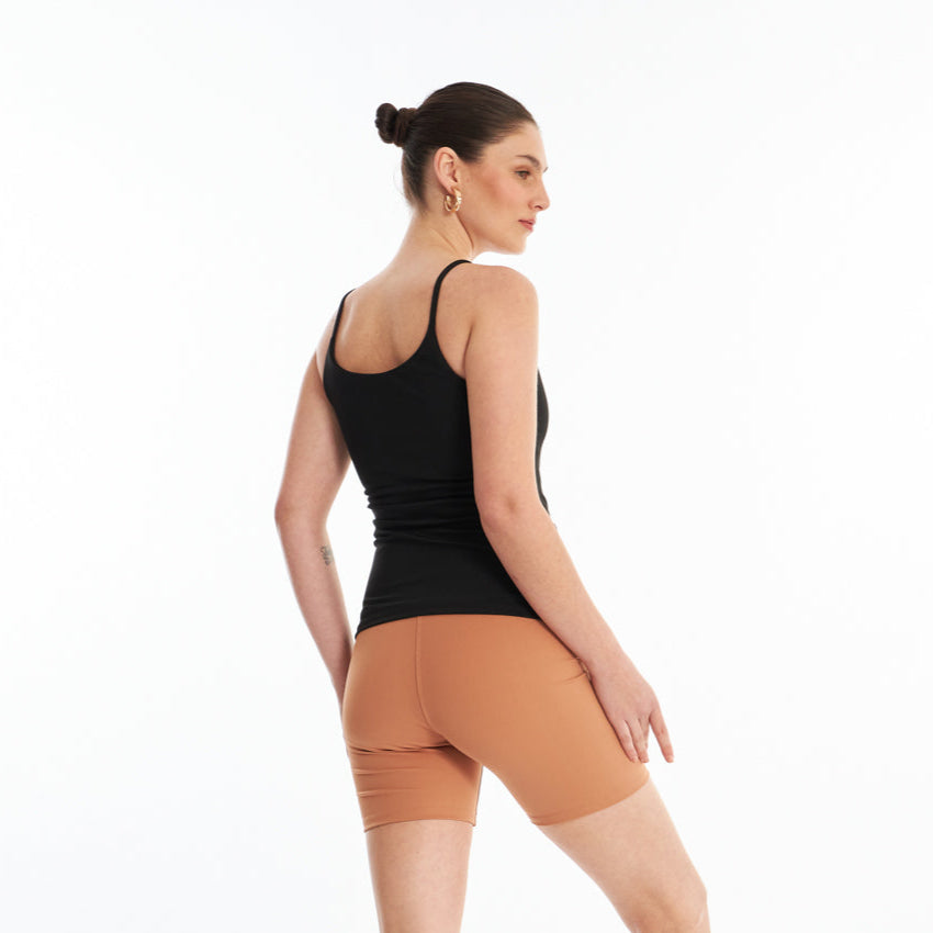 O modelo é ajustado ao corpo, proporcionando um caimento perfeito que realça a silhueta com leveza e praticidade. O diferencial desta peça está no detalhe de elastiqueira, estrategicamente posicionado para garantir proteção ao busto tanto na parte frontal quanto nas costas.
