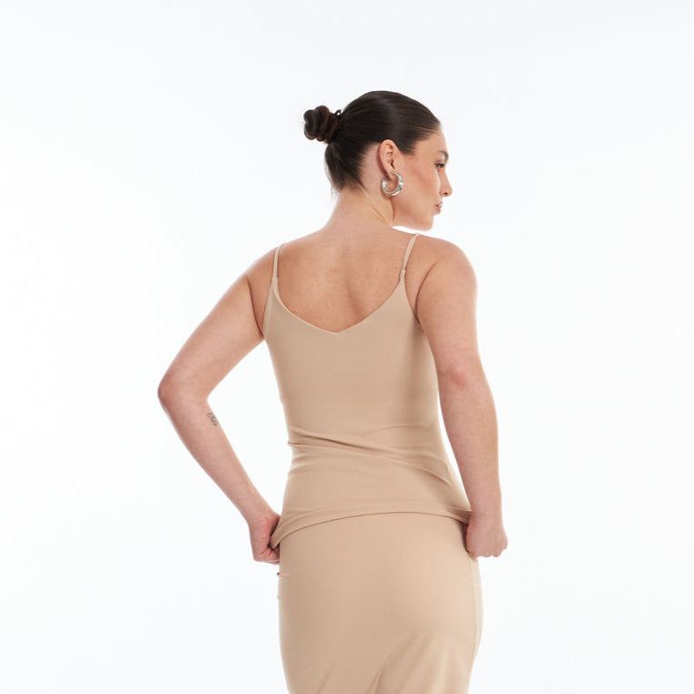 A Blusa Leveza é uma blusa de alcinha com decote V. Confeccionada em poliamida com tecnologia sustentável e elastano, a Blusa Leveza proporciona um toque agradável como um abraço. Sua modelagem ajustada ao corpo e a dupla camada na parte do busto com elástico interno garantem conforto quanto à transparência e segurança quanto à sustentação. O refinado acabamento e costura embutida, as alças em rolotê, o decote em V frente e costas são detalhes que agregam charme à peça.