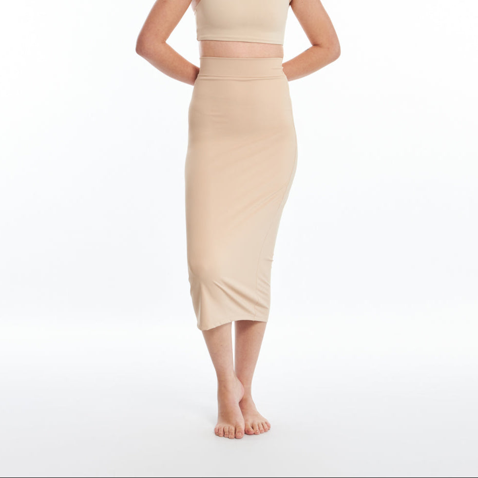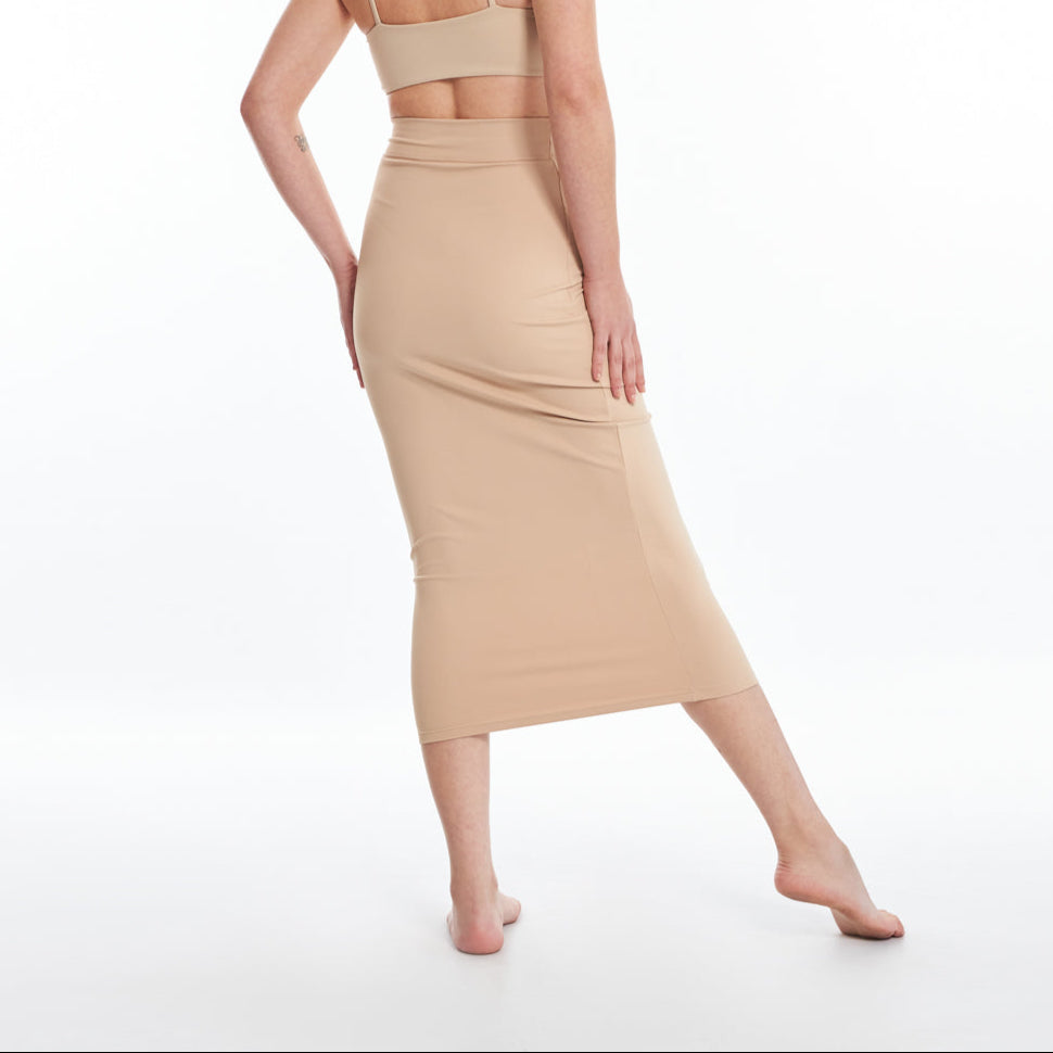 A Saia Elegância é uma saia midi confeccionada em poliamida com tecnologia sustentável e elastano, proporcionando conforto e um toque agradável como um abraço. Sua modelagem ajustada ao corpo, o cós de 5 cm e o refinado acabamento são detalhes que garantem um bom caimento e a tornam uma excelente opção como uma "anágua" moderna.